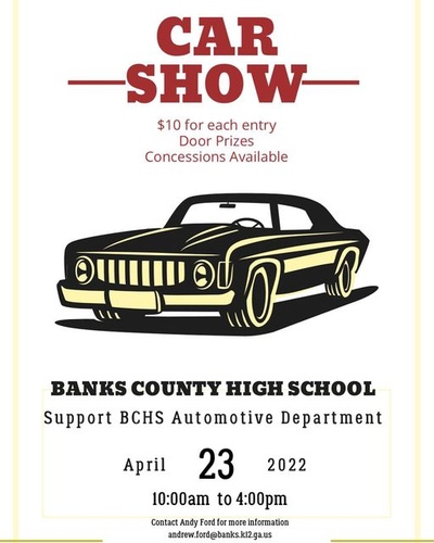Mark you calendar's for April 23, 2022. Come out with your family and friends to Support the BCHS Automotive department as they host the BCHS Car Show. Door Prizes and Concessions Available.