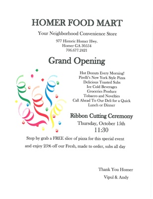 Please join us for a Ribbon Cutting Ceremony to celebrate the Grand Opening of Homer Food Mart located at 977 Historic Homer Hwy. Stop by and grab a FREE slice of pizza for this special event and enjoy 25% off our fresh, made to order, subs all day.